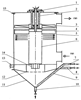 Направляющий цилиндр 12 служит для предотвращения раскручивания жидкости в бункере 11 и улучшения работы насосного устройства 14.