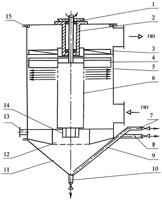 Очищающая жидкость заливается в необходимом количестве в бункер 11, с помощью насосного устройства 14 непрерывно подается в транспортирующий цилиндр 6, в верхней части которого расположены в необходимом количестве распыливающие отверстия. При диспергировании жидкости транспортирующим цилиндром 6 образуется слой струй и капель, достигнув стенок корпуса 5, капли ударяются об нее, в результате появляются вторичные капли, а на стенке корпуса 5 образуется пленка турбулизированной жидкости. Пленка жидкости стекает по корпусу 5 в бункер 11.