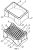 Далее патент США 5,366,088 раскрывает способный укладываться в стопу штатив для наконечников пипеток, выполненный так, что он запираемо устанавливается в другой штатив для наконечников пипеток такой же конструкции и удерживает наконечники пипеток в вертикальном положении. В описанной конструкции на боковых стенках возле верхней поверхности штатива для наконечников расположены отверстия для взаимодействия с выступами следующего штатива, установленного на этот штатив. В частности, боковые стенки содержат запираемый механизм, содержащий рычажный или поворотный элемент. Этот поворотный элемент прикреплен к стенке посредством двух шарнирных элементов, позволяющих этому элементу поворачиваться вокруг оси, проходящей через шарнирные элементы, при этом выступ расположен вдоль нижней части поворотного элемента.