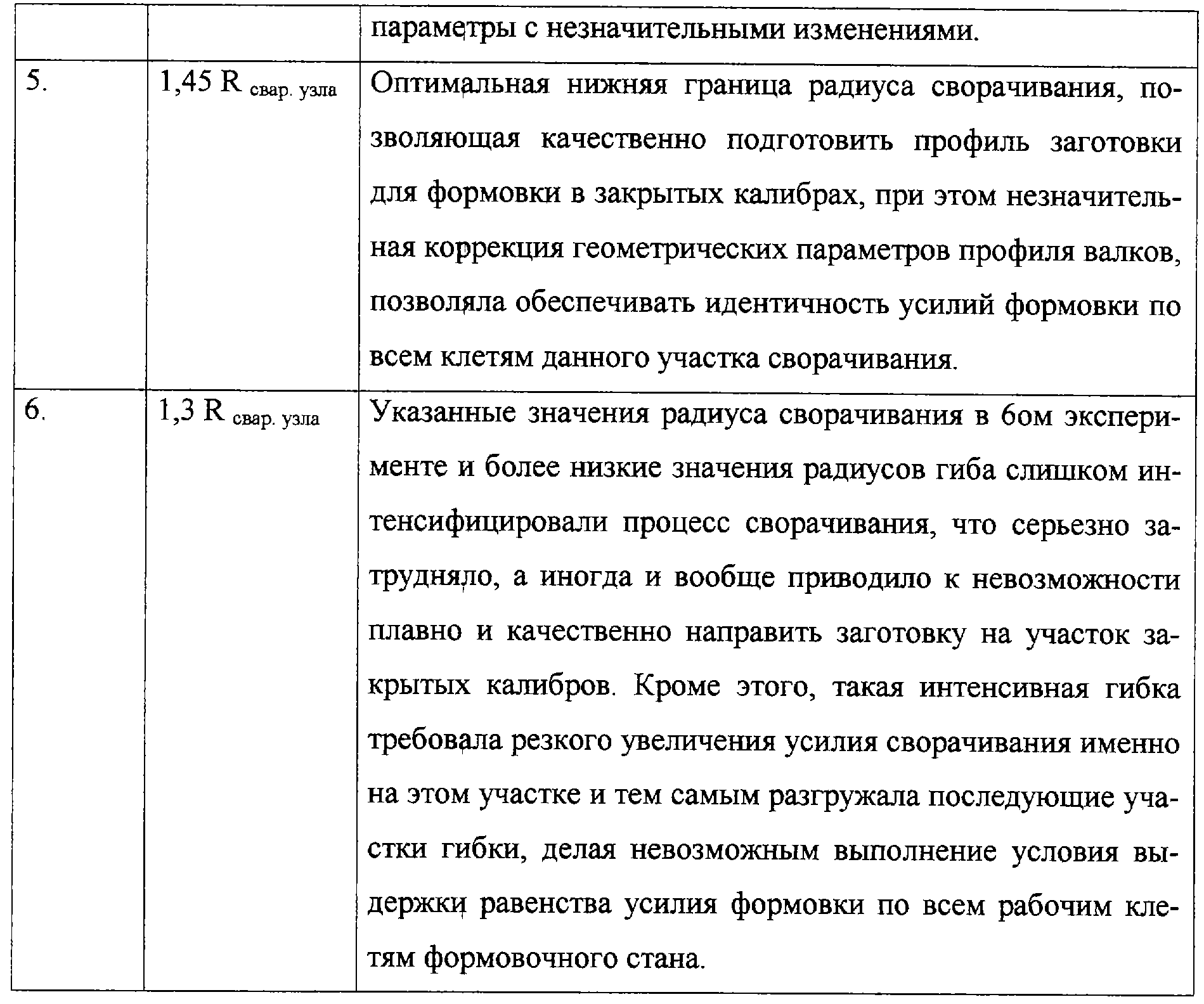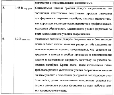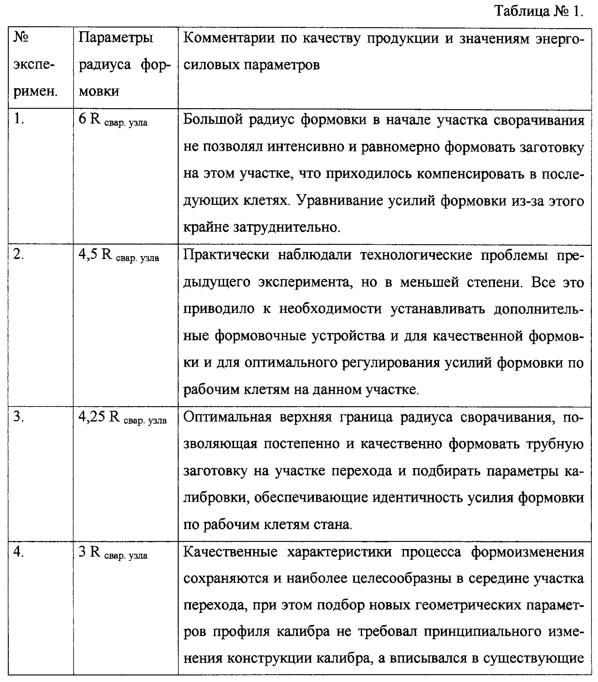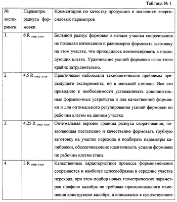 Значения радиусов кривизны на участке перехода открытых калибров выбирали в установленном диапазоне значений (1,45-4,25) Rсвар. узла, при этом радиусы формовки постепенно уменьшаются от большего значения диапазона к меньшему. Крайние значения диапазона установлены экспериментально, результаты исследований представлены в таблице №1.