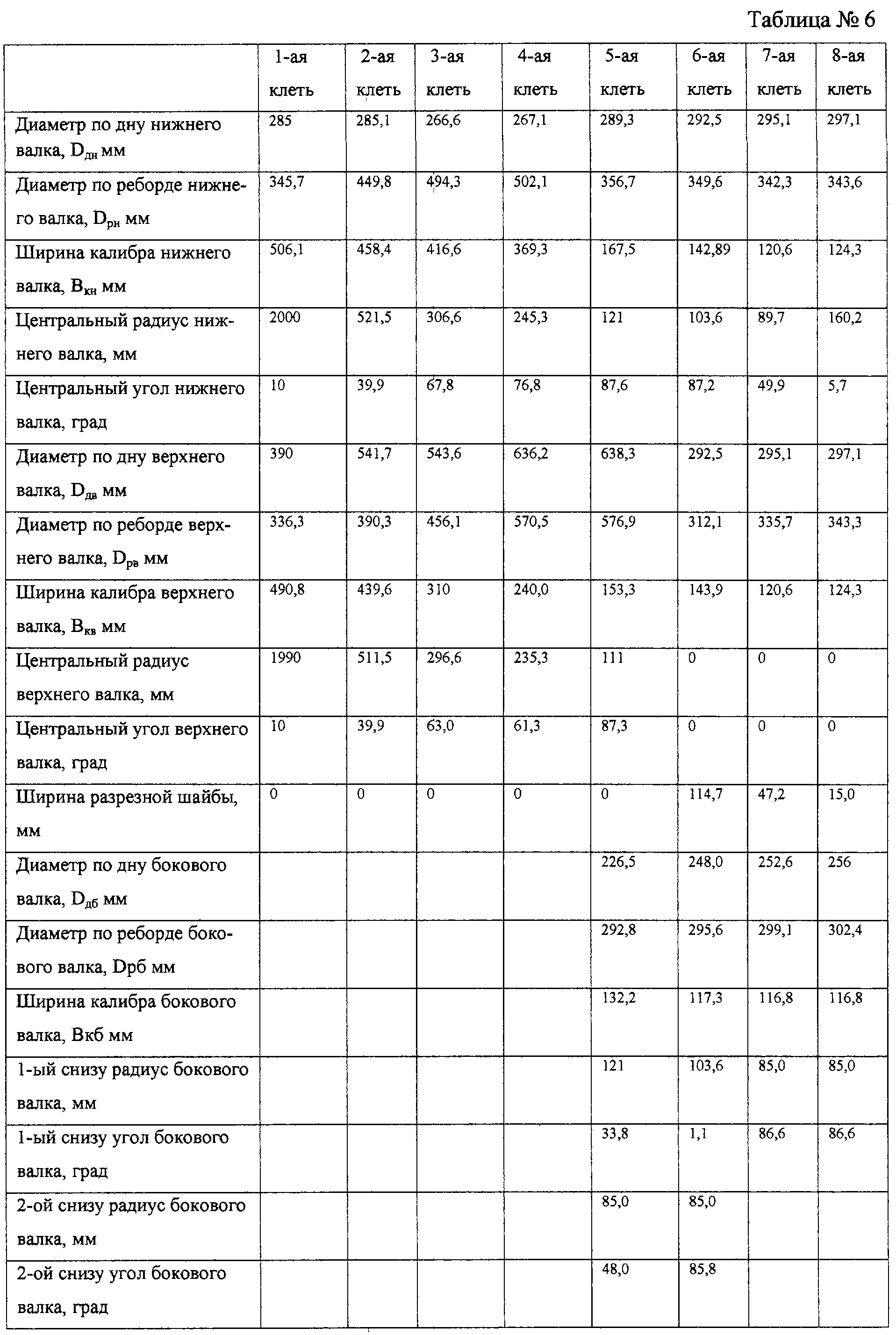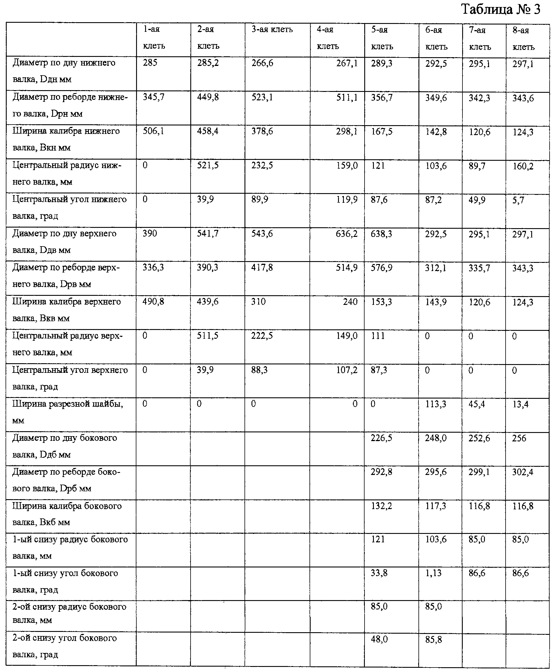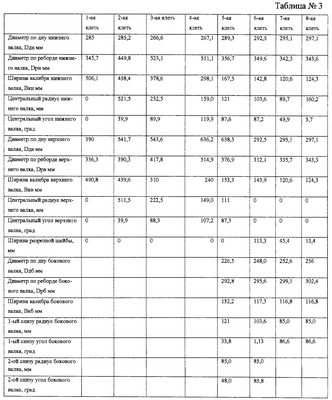 Осуществлялась формовка полосы в восьмиклетьевом формовочном стане ТЭСА 42-168 на Волгореченском трубном заводе с использованием технологического инструмента с заводской калибровкой. Существующая заводская калибровка технологического инструмента для трубы диметром 159×10 мм приведена в таблице №2