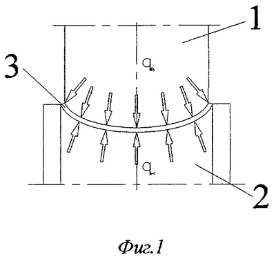 На фиг.1 представлена схема полного контакта инструмента 1, 2 и заготовки 3, которая реализуется в первых открытых калибрах, когда по всей ширине заготовки и с наружной и с внутренней стороны обеспечен контакт с профилированным валковым инструментом. При этом распределенная нагрузка q равномерно прикладывается по наружной и внутренней поверхности трубной заготовки, обеспечивая изгиб (формовку) на заданные параметры.