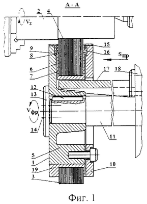 Подвижный стакан 7 с пучком ворса 4 и выпуклым днищем проходит путь (h+t) мм, получая импульсную ударную радиальную подачу с усилием Рим, обеспечивающую резание с максимальным упрочнением (см. фиг.4).