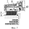 В качестве механизма импульсного нагружения Рим сегментных стаканов с проволочными пучками ворса применяется гидравлический генератор импульсов [3, 2]. При плоском иглофрезеровании заготовка вместе со столом совершает возвратно-поступательные движения Sпр и поперечную подачу Sпоп на каждый двойной ход стола, а инструменту сообщают вращательное движение Vи. Периодическую импульсную Рим нагрузку создает ГГИ и посредством бойка 13 передает ее волноводу 11 в направлении оси шпинделя (согласно фиг.1, сверху вниз). Импульсная ударная нагрузка Рим, преодолевая сопротивление пружины сжатия 14 посредством конической части волновода 12, воздействует на планки 5 с сегментными стаканами 2 с пучками ворса 3, перемещая их поперек оси шпинделя в радиальном направлении Sp от центра к периферии на величину амплитуды Аa, (см. фиг.6). После окончания действия удара сегментные стаканы 2 возвращаются к центру (см. фиг.7) с помощью пружин 7, а волновод 11 отводится вверх с помощью пружины 14 в первоначальное положение (согласно фиг.1).