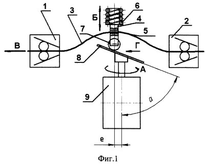 Проволоку 3 в механизм заводят через зажим 2, пропускают через отверстие 5 в штоке 4 и выводят через зажим 1. При включении привода 9 начинает вращаться кулачок 8 по стрелке “А”, воздействуя на шток 4 через ролик 7, который обкатывает кулачок 8. В результате чего шток 4 (при расположении ролика 7 на подъеме кулачка8) поднимается вверх по стрелке “Б”, сжимая пружину 6 и вытягивая проволоку 3 из зажима 2, при этом зажим 1 заклинивает и проволока 3 образует волну. При дальнейшем повороте кулачка 8, когда ролик 7 под действием пружины 6 займет крайнее нижнее положение, шток 4, опускаясь вниз по стрелке “Б”, будет выпрямлять волну проволоки 3, которая, расклинивая зажим 1, будет выходить из механизма и по шлангу (на чертеже не показан) направляться в зону сварки по стрелке “В”. В этом случае зажим 2 заклинивает. При работе механизма шток 4 совершает возвратно-поступательное перемещение по стрелке “Б”, производя то образование волны проволоки 3, то проталкивание ее через зажим 1. Частота импульсов подачи проволоки 3 зависит от скорости вращения кулачка 8. Ход подачи сварочной проволоки зависит от расстояния l, от которого зависит расстояние – l1, т.е. от ролика 7 до центра вращения кулачка 8.