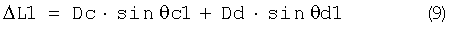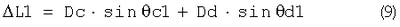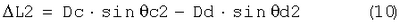 Аналогичным образом, что касается ноги 2 на задней стороне человека 1 в начале состояния двух положений, если углы отклонения бедра 9 и голени 11, определяемые с помощью средства 28 для вычисления положения ноги в начале состояния двух положений, указываются как углы с2 и d2, соответственно (см. графическое изображение, соответствующее времени t2, иллюстрируемое на фиг.11), то в таком случае расстояние L2, относящееся к ноге 2, вычисляется в соответствии с выражением (10), приведенным ниже, при использовании данных этих углов с2 и d2 отклонения ( с2>0, d2>0) и данных длин Dc и Dd бедра 9 и голени 11 соответственно.