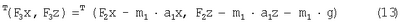 Символами T(F2x, F2z) указана сила реакции коленного сустава 10, предварительно определенная с помощью вышеуказанного выражения (11). Символами T(a1x, a1z) указано ускорение (поступательное ускорение) в абсолютной системе Cf координат центра G1 тяжести бедра 9, определяемое с помощью средства 32, которое вычисляет ускорение каждой части ноги. Ссылочным символом m1 указана масса бедра 9, определяемая заранее, а ссылочным символом g указано ускорение силы тяжести.