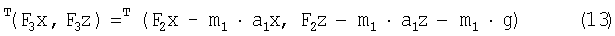 Во-первых, сначала определяют силу T(F3x, F3z) реакции сустава, действующую на тазобедренный сустав 8 бедра 9, в соответствии со следующим выражением (13) (выражение аналогичного вида, что и выражение (11)) на основе уравнения движения, относящегося к поступательному движению центра G1 тяжести (см. фиг.4) бедра 9: