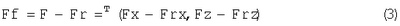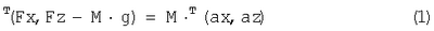 Если равнодействующая сила реакции, действующая на обе ноги 2 и 2, от опоры А указана ссылочным символом F, то равнодействующая сила F реакции опоры равна силе реакции опоры, действующей на ногу 2, находящуюся в контактном взаимодействии с грунтом, в состоянии одного положения, иллюстрируемых на фиг.1(а), тогда как она является результирующей силой сил Ff и Fr реакции опоры, действующих на обе ноги 2 и 2, соответственно, в состоянии двух положений, иллюстрируемом на фиг.1(b) ((прим. пер.) исправлено в соответствии с прилагаемой инструкцией для осуществления изменений). Если составляющие в направлении оси Х (горизонтальное направление относительно направления движения двуногого шагающего тела 1 ((прим.пер.) исправлено в соответствии с прилагаемой инструкцией для осуществления изменений)) и в направлении оси Z (вертикальное направление) ускорения а центра G0 тяжести двуногого шагающего тела 1 в абсолютной системе Cf координат, зафиксированной относительно грунта, указаны как ах и az, соответственно, а составляющие в направлении оси Х и в направлении оси Z равнодействующей силы F реакции опоры, действующей на двуногое шагающее тело 1, указаны символами Fx и Fz, соответственно, то уравнение движения центра G0 тяжести (точнее говоря, уравнение движения относительно поступательного движения центра G0 тяжести) представляется посредством выражения (1), приведенного ниже.