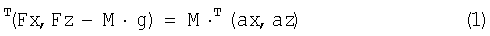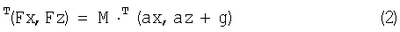 Таким образом, если определяют ускорение а=T(ах, az) центра G0 тяжести двуногого шагающего тела 1, то расчетное значение силы F=(Fx, Fz) реакции опоры может быть получено с помощью следующего уравнения (2) при использовании ускорения а, величины массы М двуногого шагающего тела 1 и величины ускорения g силы тяжести.