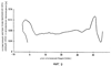Фиг.6 – диаграмма, иллюстрирующая корреляцию между составляющей в вертикальном направлении вектора точки приложения силы реакции опоры и углом отклонения бедра в течение нормальной ходьбы,