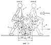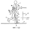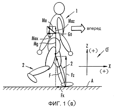 Состояния движения ног двуногого шагающего тела (состояния движения ног в течение ходьбы) включают в себя состояние одного положения (касания), в котором только одна нога 2 (передняя нога относительно направления движения на приведенном чертеже) из обеих ног 2 и 2 двуногого шагающего тела 1 находится в контактном взаимодействии с грунтом, как иллюстрируется на фиг.1(а), и состояние двух положений (касания), в котором обе ноги 2,2 находятся в контактном взаимодействии с грунтом, как показано на фиг.1(b).