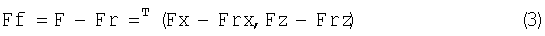 Кроме того, в соответствии с вышеуказанным выражением (3) сила Fr=T(Frx, Frz) реакции опоры, относящаяся к ноге 2 на задней стороне, вычитается из равнодействующей силы F=T(Fx, Fz) реакции опоры, определяемой в каждом времени цикла (векторное вычитание) для последовательного получения силы Ff=T(Ffx, Ffz)=T(Fx-Frx, Fz-Frz) реакции опоры, относящейся к ноге 2 на передней стороне. Таким образом, будут последовательно определены силы Fr и Ff реакции опоры соответствующих двух ног 2 и 2 в состоянии двух положений.