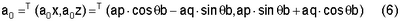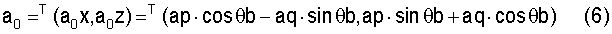 При обработке данных с помощью средства 27 для измерения опорного ускорения, ускорение а0=T(а0x, а0z) начала 0 координат вышеупомянутой системы Ср координат тела в абсолютной системе Cf координат определяют так, как это описано ниже. Если текущее значение данных детектирования ускорения талии 3 в продольном направлении, получаемых посредством вышеупомянутого измерителя 20 ускорения талии в продольном направлении, равно ар, а текущее значение данных детектирования ускорения талии 3 в вертикальном направлении, получаемых посредством измерителя 21 ускорения талии в вертикальном направлении, равно aq, то ускорение а0=T(а0х, a0z) в абсолютной системе Cf координат определяют с помощью выражения (6), приводимого ниже, из данных детектирования ар и aq и текущего значения угла b отклонения талии 3, получаемого с помощью вышеупомянутого средства 26 для измерения угла отклонения талии: