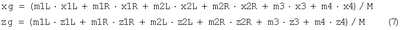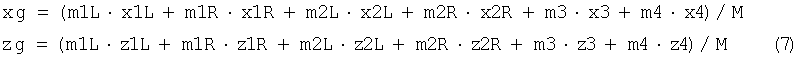 Если положение центра G3 тяжести и масса талии 3 в системе Ср координат тела указаны ссылочными символами (х3, z3) и m3, соответственно, положение центра G4 тяжести и масса туловища 40 указаны ссылочными символами (х4, z4) и m4, соответственно, положение центра G1 тяжести и масса бедра 9 ноги 2, которая расположена слева относительно направления движения человека 1, указаны ссылочными символами (x1L, z1L) и m1L, соответственно, положение центра G2 тяжести и масса голени 11 ноги 2 указаны ссылочными символами (x2L, z2L) и m2L, соответственно, положение центра G1 тяжести и масса бедра 9 ноги 2 справа указаны ссылочными символами (x1R, z1R) и m1R, соответственно, положение центра G2 тяжести и масса голени 11 ноги 2 указаны ссылочными символами (x2R, z2R) и m2R, соответственно, а масса человека 1 указана ссылочным символом М (=m1L+m2L+m1R+m2R+m3+m4), то положение (xz, zg) центра тяжести тела человека 1 в системе Ср координат тела определяется из выражения (7), приведенного ниже.