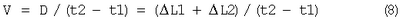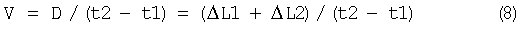 В соответствии с этим, определяют вышеупомянутые расстояния L1 и L2 и время, прошедшее от времени t1 до времени t2 (t2-t1), то есть определяют время, прошедшее за один шаг от начала состояния двух положений до другого начала состояния двух положений. Это делает возможным получение скорости V движения человека 1 от времени t1 до t2 (средней скорости движения от t1 до t2) в соответствии с выражением (8), приведенным ниже, при использовании расстояний L1 и L2 и времени, прошедшего за один шаг (t2-t1).