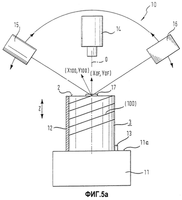 Как можно видеть на фиг.5a, устройство для ориентировки монокристалла в режущей машине содержит устройство 10, расположенное фактически вне режущей машины, для определения угла между кристаллографической плоскостью, например, плоскостью (100), и торцевой поверхностью 2 кристалла. Устройство 10 включает в себя держатель 11 для монокристалла 3 с плоской поверхностью 11a, который предпочтительно конструируют в виде вакуумного столика-держателя, на котором практически цилиндрический монокристалл удерживается своей торцевой поверхностью за счет действия парциального давления. Азимутальная ориентация монокристалла, то есть угловое положение в следующей плоскости резки, определяют посредством ориентирования платформы 7 или другого внешнего признака в устройстве 10. Монокристалл 3 в данном случае либо быстро прикрепляют к опорной пластине 12 для распиливания, с которой его затем можно вставить в аппарат для проволочного распиливания, либо адгезия происходит после измерения. Угловое положение платформы 7, придаваемое на монокристалле 3 относительно держателя 11, регулируют с помощью стопора 13 таким образом, чтобы угол , образуемый данным кристаллографическим направлением К относительно направления подачи в режущей машине, как показано на фиг.5b, имел предварительно эмпирически определенное значение, как описано выше, для минимального отклонения проволоки и, следовательно, максимально возможной скорости подачи. Держатель 11 можно передвигать в вертикальном направлении. Кроме того, держатель 11 способен вращаться посредством механизма вращения, который не показан, вокруг своей центральной оси, которая проходит параллельно центральной продольной оси монокристалла. Напротив или выше свободной поверхности 2 монокристалла 3, которая впоследствии образует поверхность первой пластины, подлежащей отрезанию, устанавливают автоколлимационный телескоп 14, который располагают так, что его оптическая ось O совпадает с нормалью к поверхности 11a держателя 11. Кроме того, устанавливается рентгеновский гониометр, состоящий из рентгеновской трубки 15 и связанного с ней детектора 16, который можно передвигать в предварительно заданном угловом диапазоне, например, составляющем примерно 20°, вокруг начальной точки на поверхности 2 монокристалла. Кроме того, устанавливают плоскопараллельное оптическое зеркало 17. Зеркало 17 можно зафиксировать с помощью вакуумного механизма, который не показан, на торцевой поверхности 2 монокристалла. Кроме того, зеркало 17 можно зафиксировать на торцевой поверхности 2 монокристалла 3 так, чтобы оно лежало на оптической оси автоколлимационного телескопа. Диапазон измерения автоколлимационного телескопа составляет приблизительно ±1°. В том случае, когда угол, который имеет торцевая поверхность 2 кристалла относительно плоской поверхности 11a, превышает указанный диапазон измерения, предусмотрена пластина оптического клина, которая не показана, имеющая заданный угол клина, который вызывает заданное отклонение луча, например, на 2°, для того чтобы привести измеряемую поверхность снова в пределы диапазона измерения.