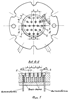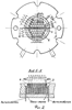 На фиг.1 представлена пресс-форма для формования душевых сеток, вид сверху со снятой крышкой пресс-формы и локальным разрезом, с количеством отверстий в душевой сетке, равным 19, и величиной , равной 11 мм.