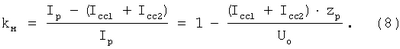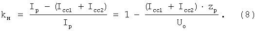 Затем измеряют падения напряжения: Uc на стыке 2 и Uо на отрезке сплошного рельса длинной один метр, а также токи Icc1 – в основном стыковом рельсовом соединителе 4 и Iсс2 – в дублирующем стыковом рельсовом соединителе 5. Ток Iн в накладках 3 находится по результатам вычислений.
