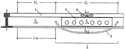 В соответствии с типами применяемых основного 4 и дублирующего 5 рельсовых стыковых соединителей задаются нормативными относительными значениями распределения тока в рельсе Iр по элементам токопроводящего стыка: