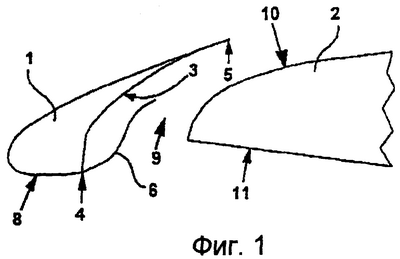 Если на вогнутой обратной стороне предкрылка 1, как предусмотрено на фиг.9, не выполнена разделительная поверхность 6, то в выдвинутом положении предкрылка 1 создается срыв проходящего через участок 9 потока в зазоре между предкрылком 1 и основным крылом 2 в форме выраженной уловленной турбулентности 12 воздуха. Эта турбулентность воздуха 12 во время взлета и снижения пассажирского самолета (в выдвинутом из основного крыла 2 положении предкрылка 1) постоянно снабжается энергией от граничащего потока в зазоре. Через так называемую фиктивную линию разъединяющего потока, находящуюся между областью вихревого потока и потоком в зазоре, турбулентные моли непрерывно попадают в ускоренный поток в зазоре, вследствие чего затем создается шум, в частности в результате истечения турбулентных молей над верхней кромкой 5 (верхняя задняя кромка), соответственно верхней задней кромкой предкрылка 1.
