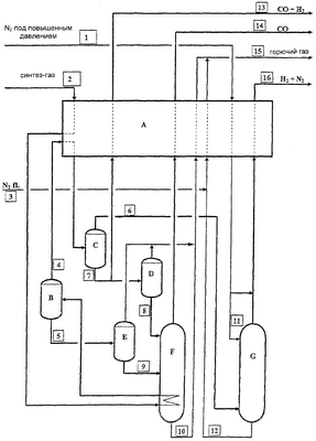 Промывная колонна G служит для очистки водорода жидким азотом и для одновременного получения водородно-азотной смеси. Промывная колонна G находится под давлением около 77 бар и имеет температуру около минус 185±10°С. В нижнюю часть промывной колонны G по трубопроводу из выпарного аппарата С вводится почти чистый газообразный водород 6. В промывную колонну G подают жидкий азот, благодаря чему в промывной колонне G образуется смесь водорода и азота, которая имеет остаточную концентрацию монооксида углерода и аргона менее 5 частей на млн, соответственно менее 150 частей на млн. Отобранный сверху из промывной колонны G продукт затем можно смешать с другими потоками газообразного азота, установить молярное соотношение водорода к азоту около 3:1, в общем случае, молярное отношение 2,995, и после пропускания через теплообменник А использовать в качестве синтез-газа для синтеза аммиака. В нижней части промывной колонны G образуется смесь из жидкого монооксида углерода, аргона и азота, давление которой сбрасывают до значения 1,3 бар и которую после пропускания через теплообменник А используют в качестве горючего газа.