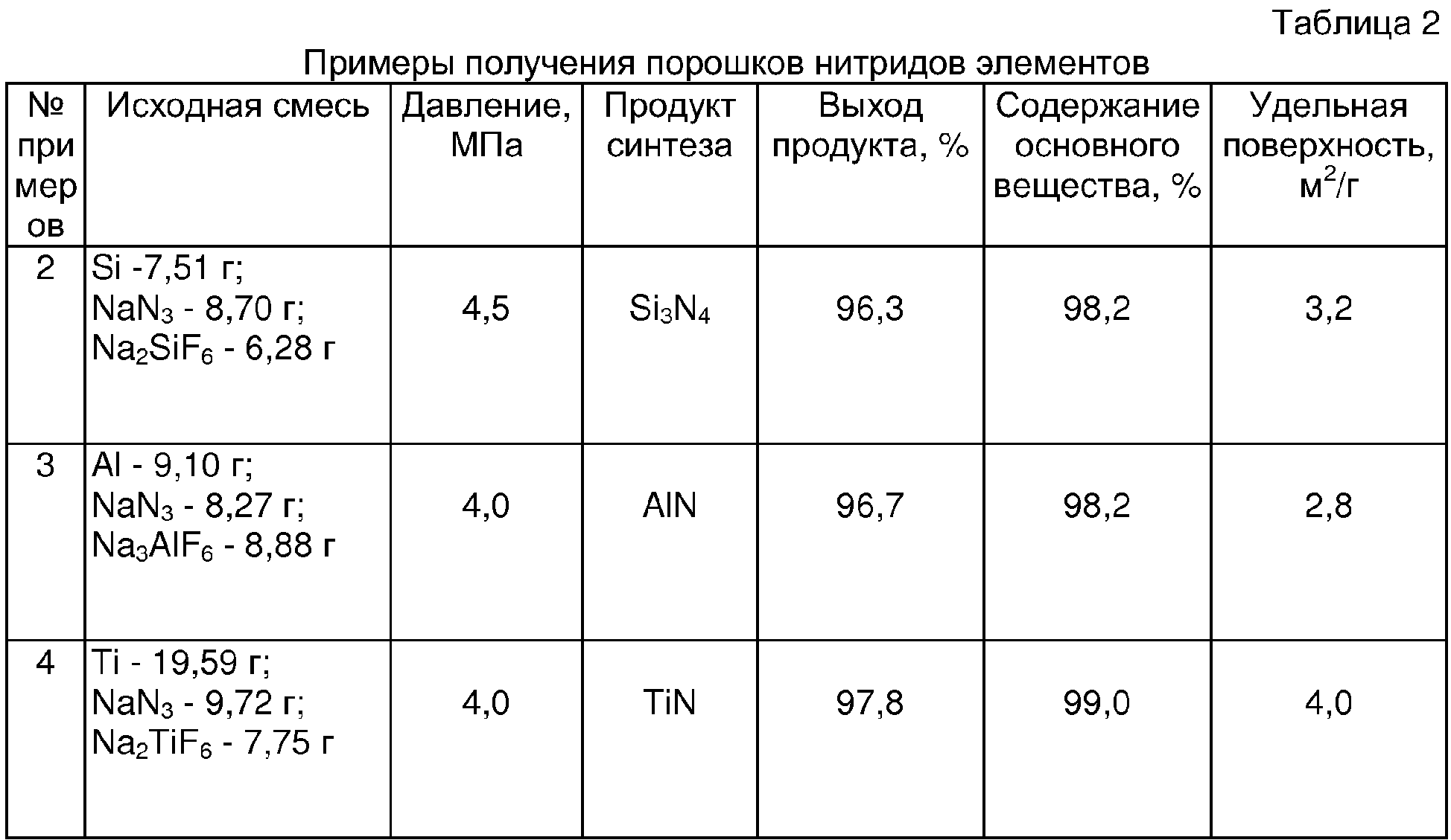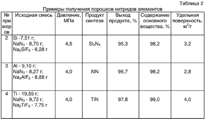Способ получения порошков нитридов элементов, включающий приготовление экзотермической смеси, состоящей из азотируемого элемента, неорганического азида и галоидной соли, и воспламенение смеси в среде азота под давлением, отличающийся тем, что в качестве галоидной соли используют комплексные фторидные соли щелочных металлов: Na2SiF6, Na3AlF6, KBF4, Na2TiF6.