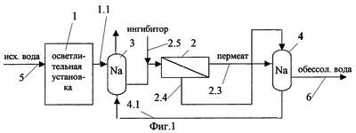 Пример 1. Вода Каспийского моря после очистки на осветлительной установке 1 поступает на умягчение на противоточных Na-катионитных фильтрах 3, загруженных сильнокислотным катионитом КУ-2-8. Далее частично умягченная вода с кальциевой жесткостью Ж=0,7 мг-экв/л и с содержанием ингибитора 3 мг/л подается на обессоливание в одноступенчатой УОО 2 (фиг.1), оснащенной мембранными элементами Filmtec SW 30 HR-380. Пермеат УОО 2 с жесткостью Ж=50 мкг-экв/л подается на доумягчение на Na-катионитные фильтры 4. Остаточная жесткость пермеата после Na-катионитных фильтров 4 Ж 1 мкг-экв/л. Выход пермеата составляет 80% от расхода исходной воды. Концентрат УОО 2 с содержанием Na=1040 мг-экв/л и Ж=13 мг-экв/л подается на регенерацию Na-катионитных фильтров 4, установленных на линии 2.3 пермеата. Отработанный концентрат после этих фильтров подается на регенерацию противоточных Na-катионитных фильтров 3, установленных на линии 1.1 осветленной воды перед УОО 2.