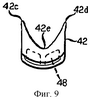 Лоток для капель стекломассы в соответствии с осуществлением согласно Фиг.7-12 указан общим обозначением 40 и, кроме указываемых ниже исключений, лоток 40 для капель стекломассы с точки зрения конструкции и функции соответствует лотку 20 для капель стекломассы. Так, лоток 40 для капель стекломассы имеет криволинейный элемент 42 с верхним входом 42а капель стекломассы и нижний конец 42b выхода капель стекломассы. Согласно Фиг.9 и 10: элемент 42 имеет конфигурацию сечения в виде обращенной вверх буквы V с криволинейным скруглением 42е, от которого криволинейные противоположные стороны 43с, 42d проходят вверх. При этом радиус скругления 42е меньше радиуса наименьшей капли стекломассы, проходящей через лоток 40 для капель стекломассы; и интервал между свободными концами сторон 42с, 42d превышает ширину самой крупной капли стекломассы, проходящей через лоток 40 для капель стекломассы; в результате чего все капли стекломассы в широком диапазоне размеров капель будут опираться в противоположных положениях на стороны 42с, 42d и не будут контактировать со скруглением 42е, и поэтому будет исключено местное охлаждение за счет хладагента капленарезочного устройства, который может протекать через лоток 40 для капель стекломассы. Элемент 42, с которым соединен опорный элемент 44, может быть выполнен литым из соответствующей жаропрочной нержавеющей стали или алюминия, и в этом случае опорный элемент предпочтительно отливают заодно с элементом 42. Элемент 42 и опорный элемент 44 могут быть также изготовлены из отдельных деталей. В любом случае опорный элемент 44 имеет впускное отверстие 46а для хладагента и выпускное отверстие 46b для хладагента, через которые может протекать вода или другой жидкий хладагент через пространство 48 в косвенной охлаждающей взаимосвязи с контактирующими с каплями стекломассы поверхностями элемента 42. Проходящую в продольном направлении перегородку 48а обеспечивают в пространстве 48, чтобы разделить его на параллельные проходы впуска и обратного потока.
