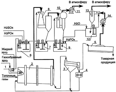 Способ получения диаммонийфосфата по настоящему изобретению реализуется следующим образом: в трубчатый реактор 1 подается жидкий и газообразный аммиак при их соотношении 1:(0,25÷3,0), соответственно, и фосфорнокислый раствор из сборника 6. Подача в трубчатый реактор 1 жидкого и газообразного аммиака осуществляется автоматически по расходу фосфорной кислоты из сборника 6. Соотношение жидкого и газообразного аммиака изменяют от 1:0,25 до 1:3,0, что определяет количество товарной фракции в гранулированном продукте после барабанного гранулятора-сушилки 2. При увеличении количества газообразного аммиака содержание мелкой фракции в продукте увеличивается, а при уменьшении – уменьшается. Продукт реакции нейтрализации – пульпа диаммонийфосфата, имеющая температуру 147÷150°С, распыляется в барабанном грануляторе-сушилке 2 на слой продукта и высушивается топочными газами. Так как во время реакции нейтрализации выделяется большое количество тепла, то при увеличении соотношения жидкого и газообразного аммиака от 1:0,9 и выше, продукт высушивается преимущественно реакционным теплом. Высушенный продукт просеивается через грохот 3, крупная фракция измельчается в дробилке 4 и вместе с мелкой фракцией возвращается в барабанный гранулятор-сушилку 2, а товарная фракция 2÷4 мм охлаждается в охладителе 5. Воздух вместе с пылью диаммонийфосфата отсасывается из охладителя 5 вентилятором 14, очищается водой в абсорбере 13 и выбрасывается в атмосферу. Абсорбционная жидкость – раствор фосфатов аммония – из сборника 12 поступает в сборник второй ступени очистки газа 9, в который подается фосфорная кислота. В абсорбере 10 газ очищается от остатков аммиака и фтора и вентилятором 11 выбрасывается в атмосферу. Избыток фосфорнокислого раствора из сборника 9 подается в сборник 7 первой ступени очистки газов. Из барабанного гранулятора-сушилки 2 газ с температурой 95÷110°С попадает в абсорбер первой ступени очистки газов, в котором мольное соотношение NH3:Н3PO4 фосфорнокислотной абсорбционной жидкости повышается до 1,1÷1,3, а избыток жидкости попадает в реакторный бак 6, куда добавляется фосфорная кислота с концентрацией 52% по Р2O5 и серная кислота с концентрацией 92,5%. Из реакторного бака 6 фосфорнокислый раствор с температурой 80÷90°С и мольным соотношением NH3:Н3PO4=0,5÷0,7 подается в трубчатый реактор 1 для нейтрализации жидким и газообразным аммиаком.