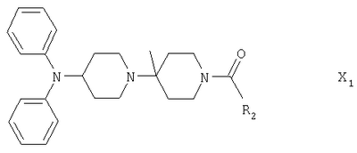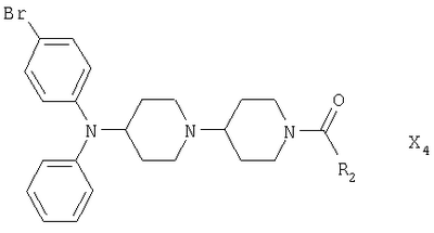 д) [1,4′]Бипиперидинил-4-ил-(4-бромфенил)фениламин получают из трет-бутилового эфира 4-[(4-бромфенил)фениламино]-[1,4′]бипиперидинил-1′-карбоновой кислоты, как описано в примере 1б). MC/ESI 414 (М+Н)+.