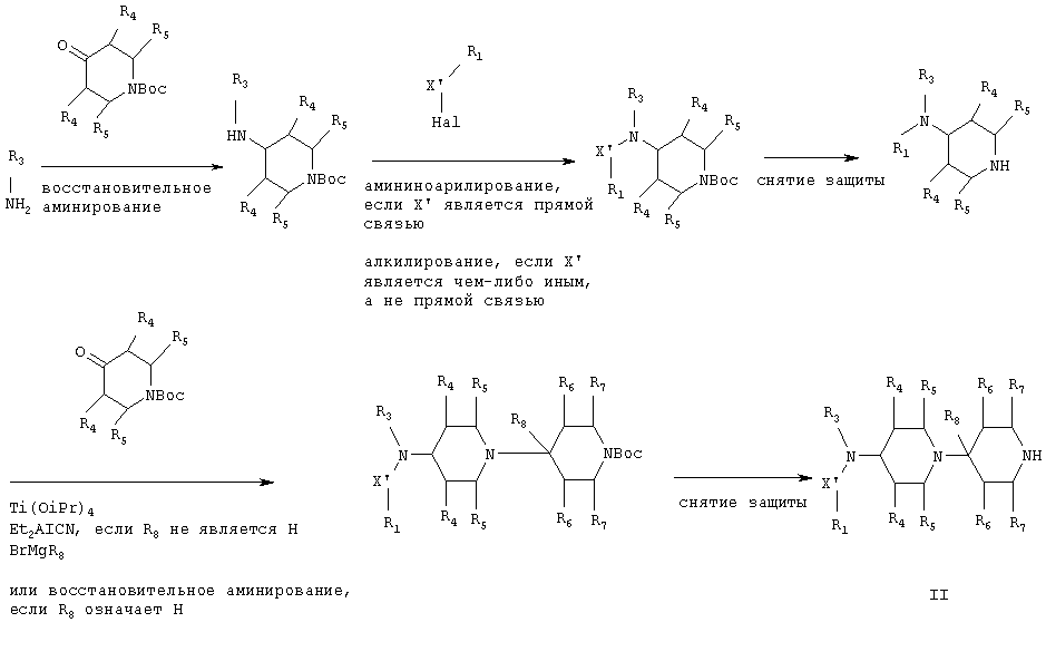 где X’ и R1-R8 являются такими, как определено выше, и Hal означает хлор, бром или иод. В приведенных выше формулах Boc является защитной группой, означающей трет-бутоксикарбонил. Эта защитная группа может быть заменена в приведенной выше реакционной схеме любой защитной группой для аминогруппы, например, указанными Т.W.Greene в “Protective Groups in Organic Synthesis”, J.Wiley & Sons NY, 2-е издание, глава 7, 1991, и в приведенных ссылках, например, бензилоксикарбонилом или 9-флуоренилметоксикарбонилом.