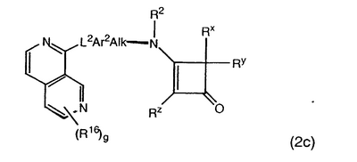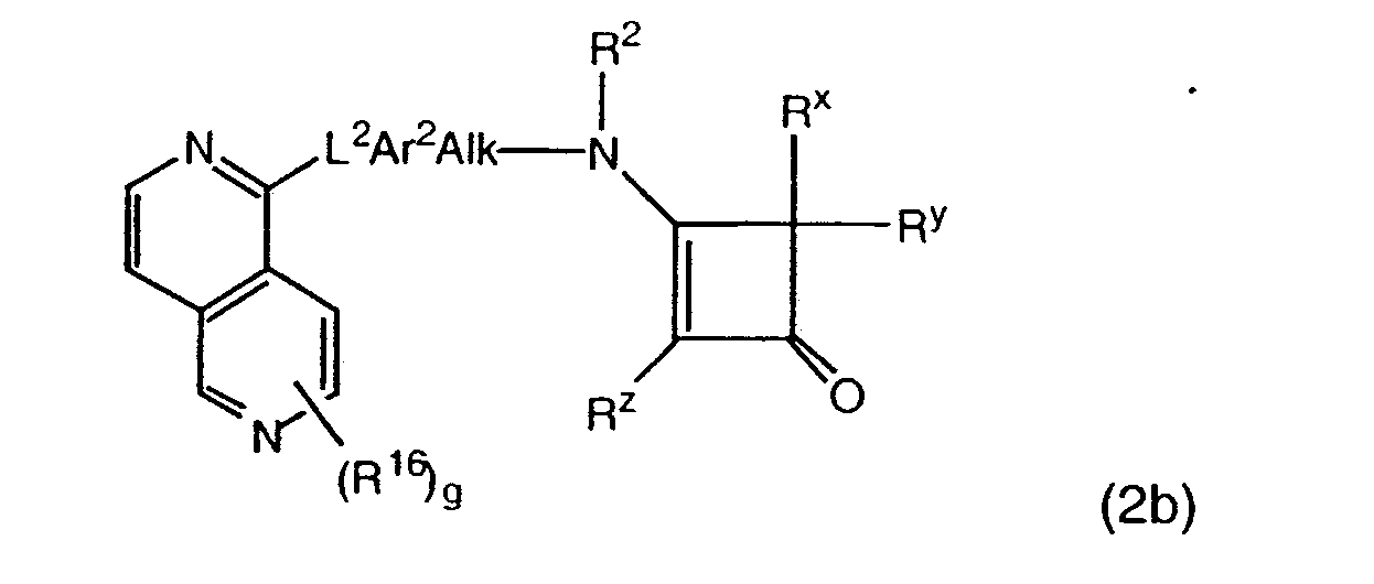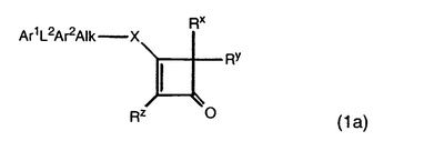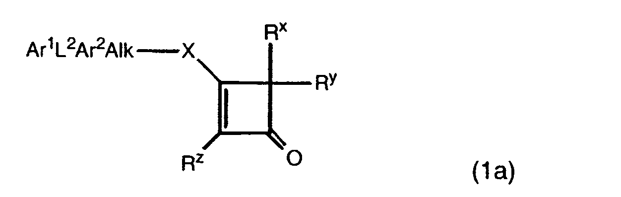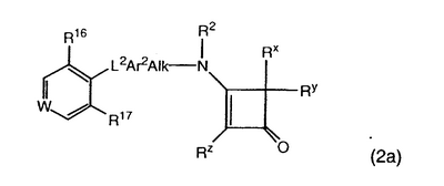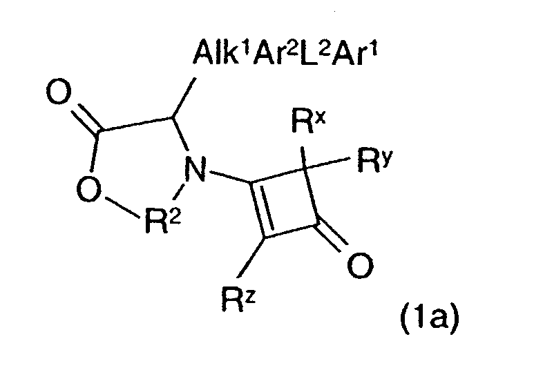 где а и b означают положения присоединения L2 и Alk соответственно. 6. Соединение по п.5, где Ar2 представляет 1,4-фениленовую группу. 7. Соединение по любому из пп.1-6, где Ar1 представляет необязательно замещенную фенильную или 5-, 6- или 10-членную гетероароматическую группу. 8. Соединение по п.7, где Ar1 представляет необязательно замещенную пиридильную, пиримидинильную, нафтиридинильную, хинолинильную или изохинолинильную группу. 9. Соединение по п.8, где Ar1 представляет 2,7-нафтиридинильную группу. 10. Соединение по любому из пп.1-9, где Rz представляет атом галогена. 11. Соединение по п.10, где Rz представляет атом брома. 12. Соединение по любому из пп.1-9, где Rz представляет необязательно замещенную С1-8алкильную группу. 13. Соединение по любому из пп.1-9, где Rz представляет группу – L1(Alk1)nR3, где L1 представляет атом -О-, -S-, -Se- или группу -S(O)-, -NH- или -N(CH3)-. 14. Соединение по любому из пп.1-9, где Rz представляет группу – L1(Alk1)nR3, где L1 представляет ковалентную связь. 15. Соединение по п.13 или 14, где n равно 0. 16. Соединение по п.13 или 14, где n равно целому числу 1, a Alk1 представляет необязательно замещенную С1-6алкиленовую цепь. 17. Соединение по п.15 или 16, где R3 представляет атом водорода или необязательно замещенную С3-10циклоалифатическую, С3-10гетероциклоалифатическую, С6-12ароматическую или С1-9гетероароматическую группу. 18. Соединение по любому из пп.1-17, где каждый из Rx и Ry представляет необязательно замещенную С1-8алкильную группу. 19. Соединение по любому из пп.1-17, где Rx и Ry, связанные вместе, образуют необязательно замещенную спиросвязанную С3-10циклоалифатическую или С3-10гетероциклоалифатическую группу. 20. Соединение, которое представляет собой: (2S)-2-[(3-оксоспиро[3.5]нон-1-ен-1-ил)амино]-3-{4-[(3,5-дихлоризоникотиноил)амино]фенил}пропановую кислоту, (2S)-2-[(3-оксоспиро[3.5]нон-1-ен-1-ил)амино]-3-{4-[(3-метил[2,7]нафтиридин-1-ил)окси]фенил}пропановую кислоту, (2S)-2-[(2-бром-3-оксоспиро[3.5]нон-1-ен-1-ил)амино]-3-{4-[(3,5-дихлоризоникотиноил)амино]фенил}пропановую кислоту, (2S)-2-[(2-бром-4,4-диметил-3-оксо-1-циклобутенил)амино]-3-{4-[(3,5-дихлоризоникотиноил)амино]фенил}пропановую кислоту, (2S)-2-[(2-бром-3-оксоспиро[3.5]нон-1-ен-1-ил)амино]-3-{4-[(2,7)нафтиридин-1-илокси]фенил}пропановую кислоту, (2S)-2-[(2-бром-3-оксо-7-оксаспиро[3.5]нон-1-ен-1-ил)амино]-3-{4-[(3,5-дихлоризоникотиноил)амино]фенил}пропановую кислоту, (2S)-2-[(2-бром-3-оксоспиро[3.5]нон-1-ен-1-ил)амино]-3-(2,6-диметокси[1,1′-бифенил]-4-ил)пропановую кислоту, (2S)-2-{(3-оксоспиро[3.6]дек-1-ен-1-ил)амино}-3-{4-[(3,5-дихлоризоникотиноил)амино]фенил}пропановую кислоту, (2S)-2-[(2-бром-3-оксоспиро[3.6]дек-1-ен-1-ил)амино]-3-{4-[(3,5-дихлоризоникотиноил)амино]фенил}пропановую кислоту, (2S)-2-{[4,4-диметил-2-(фенилселененил)-3-оксо-1-циклобутенил]амино}-3-{4-[(3,5-дихлоризоникотиноил)амино]фенил}пропановую кислоту, (2S)-2-[(2-бром-7-метокси-3-оксоспиро[3.5]нон-1-ен-1-ил)амино]-3-{4-[(3,5-дихлоризоникотиноил)амино]фенил}пропановую кислоту, (2S)-2-{(2-бром-3-оксоспиро[3.5]нон-1-ен-1-ил)амино]-3-{4-[(3-метил[2,7]нафтиридин-1-ил)окси]фенил}пропановую кислоту, (2S)-2-{[2-(фенилсульфанил)-4,4-диметил-3-оксо-1-циклобутенил]амино}-3-{4-[(3,5-дихлоризоникотиноил)амино]фенил}пропановую кислоту, (2S)-2-[(2-хлор-3-оксоспиро[3.5]нон-1-ен-1-ил)амино]-3-{4-[(3,5-дихлоризоникотиноил)амино]фенил}пропановую кислоту, (2S)-3-{4-[(3,5-дихлоризоникотиноил)амино]фенил}-2-(3-оксо-2-пиридин-3-илспиро[3.5]нон-1-ен-1-иламино)пропановую кислоту, (2S)-2-[(2-иод-3-оксоспиро[3.5]нон-1-ен-1-ил)амино]-3-{4-[(3,5-дихлоризоникотиноил)амино]фенил}пропановую кислоту