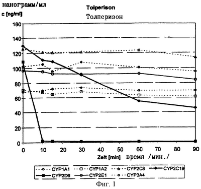 На фиг.1 представлено различное снижение концентрации толперизона в результате расщепления ферментов посредством оксидазы цитохрома по времени.