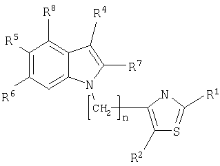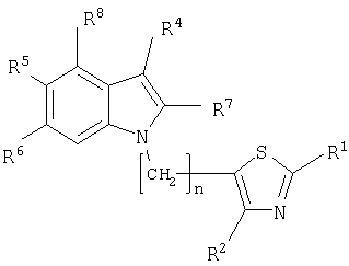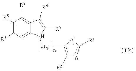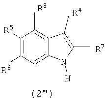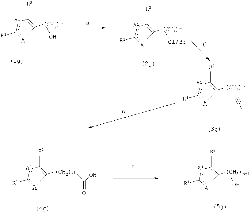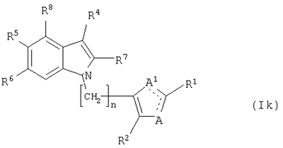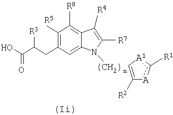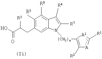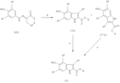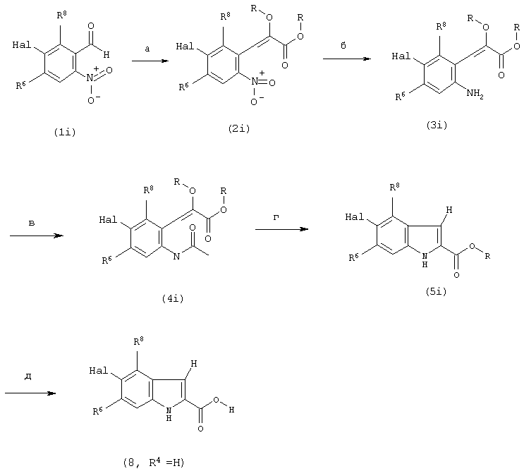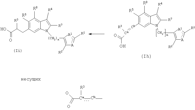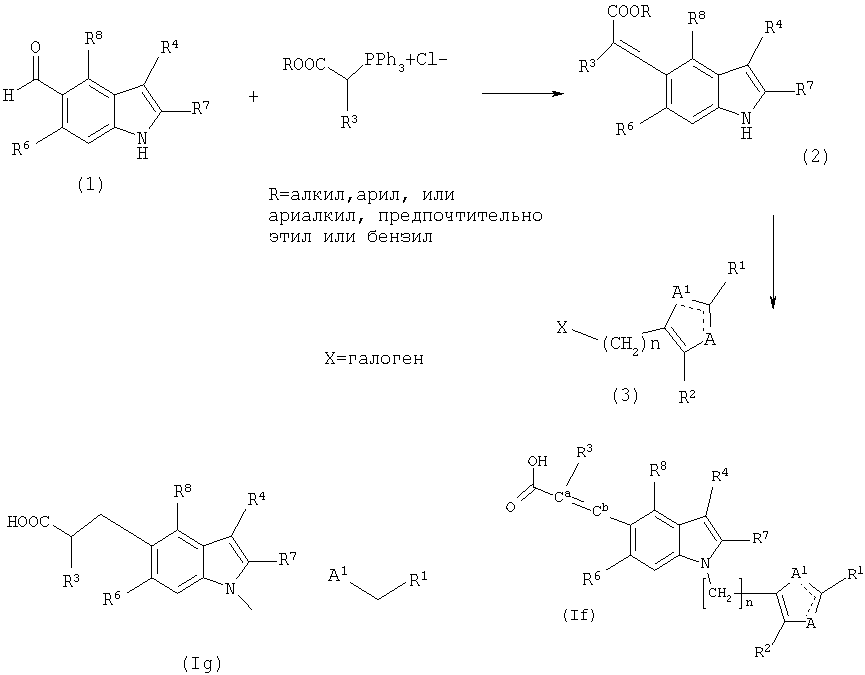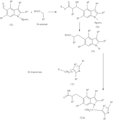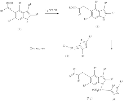 заместитель в положении 6 индола. Другое получение соединения (Ig) в соответствии со схемой II нужно применять преимущественно в том случае, когда радикалы R3, R4, R5, R6, R7 и R8 являются постоянными, a R1, R2 и А, А1 и n изменяются, и когда синтезируют гомохиральные соединения, после чего следуют реакции того же типа, как показано на Схеме I. В дополнение к этому, образование in situ соединений (Ig) можно осуществить обработкой смеси индолов (4) и гетероциклов (3) избытком гидрида натрия в таком растворителе, как N,N-диметилформамид, при температуре между 0°С и комнатной температурой, что прямо приводит к кислотам (Ig). Гомохиральные кислоты (Ig) могут быть получены приготовлением оптически чистых или оптически обогащенных промежуточных (например, ферментативным разложением на составные части рацемических сложных эфиров (4) с использованием, например, липазы, с последующей этерификацией разложенных кислот после разделения) и последующей трансформацией таких оптически чистых или оптически обогащенных сложных эфиров (4) в оптически чистые или оптически обогащенные кислоты (Ig). Альтернативно, рацемические или оптически обогащенные кислоты (Ig) могут быть разделены на их антиподы известными в данной области методами, такими как разделение антиподов через их диастереомерные соли кристаллизацией с оптически чистыми аминами, как, например, (R) или (S)-1-фенилэтиламин, (R) или (S)-1-нафталин-1-илэтиламин, бруцин, хинин или хинидин, или разделением антиподов специальными хроматографическими методами с применением либо хиральных адсорбентов, либо хиральных элюентов. Соединения общей формулы (I), в особенности соединения, в которых R5 принимает различные значения, могут быть получены в соответствии со Схемой III: Схема III Аналогичная реакционная схема с той же самой последовательностью реакций применима к ряду изомерных соединений с целью получения соединений общей формулы (I), в частности соединений, соответствующих формуле (Ii),