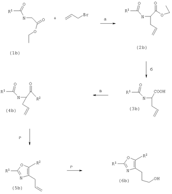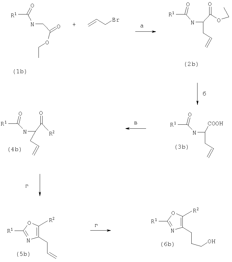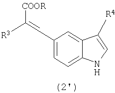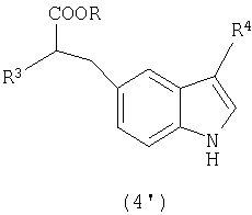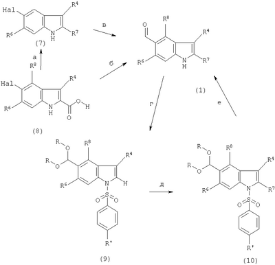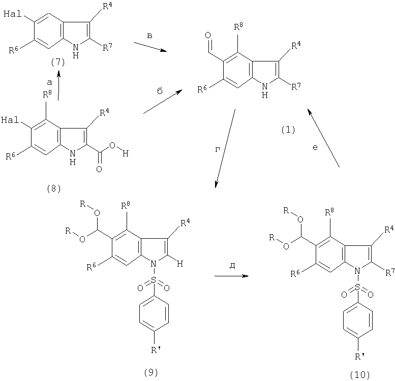 заместитель в положении 6 индола. Формилиндолы (5), имеющие подходящую защитную функциональную группу на азотной группе индола, например, 2-триметилсиланилэтоксиметильную группу (СЭМ) или бензолсульфонильную группу, могут вступать в реакцию с енолятами эфиров алкокси-, алкенилокси- или арилоксиуксусных кислот (предпочтительно полученных при -78°С в таком растворителе, как тетрагидрофуран, в присутствии основания, такого как диизопропиламид лития) при пониженной температуре с получением альдольных соединений (6) в виде смеси диастереомерных рацематов. Соединения (6) могут быть переведены в индолпропионовые кислоты (4) посредством различных путей синтеза в зависимости от используемой защитной группы и природы радикала R3. Если R3 содержит двойную связь и если в качестве защиты функциональной группы индола используется бензолсульфонильная группа, то тогда предпочтительно применяют следующую двухстадийную методику: 1) удаление воды обработкой п-толуолсульфокислотой в таком растворителе, как бензол, предпочтительно при кипячении; 2) реакцию с магнием в метаноле при нагревании с обратным холодильником, с целью одновременного восстановления двойной связи и удаления защитной группы. Если R3 не содержит двойной связи и если в качестве защиты функциональной группы индола используется 2-триметилсиланилэтоксиметильная группа (СЭМ), то тогда предпочтительно применяют следующую пятистадийную методику: 1) обработку метансульфонилхлоридом в таком растворителе, как дихлорметан, с последующей обработкой, например, 1,8-диазабицикло[5.4.0.]ундек-7-еном(1,5,5) в таком растворителе, как тетрагидрофуран, предпочтительно при повышенной температуре с получением ненасыщенных сложноэфирных соединений в виде смеси Е и/или Z изомеров; 2) гидрирование двойной связи в присутствии, например, палладия на угле в таком растворителе, как этанол; 3) омыление сложноэфирной группы с применением стандартных условий; 4) удаление защитной группы с помощью, например, тетра-бутиламмоний фторида (в виде раствора в тетрагидрофуране) в таком растворителе, как N,N-диметилформамид, в присутствии этилендиамина в предпочтительном интервале температур между 50°С и 80°С; 5) повторную этерификацию с использованием, например, метилиодида, гидрокарбоната натрия в N,N-диметилформамиде. Затем может быть проведено превращение соединений (4) в соединения (Ig) посредством конденсации с гетероциклами (3) так, как показано на Схемах I и II. 5-Формилиндолы (1), в которых R6 представляет собой водород, алкил илициклоалкил, или соответствующие 6-формильные аналоги, в которых R5 представляет собой водород, алкил или циклоалкил, используемые в качестве исходных материалов в Схеме I, являются известными соединениями или могут быть синтезированы методами, известными в данной области. Некоторые выборочные синтетические пути для получения 5-формилиндолов (1), которые также применимы для синтеза 6-формилиндолов, показаны на Схеме IV. Схема IV R обозначает алкил; R’ обозначает водород или алкил. Превращение галогенированных индолов (7) в формилиндолы (1) может быть осуществлено, например, обработкой соответствующих бром- или иодиндолов таким реагентом, как алкиллитий, например, н-бутиллитий, в таком растворителе, как тетрагидрофуран, предпочтительно при -78°С с последующей обработкой N,N-диметилформамидом или кар