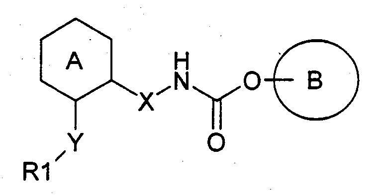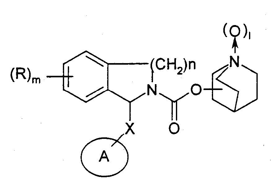 Данное изобретение имеет отношение к новым терапевтически эффективным производным карбамата хинуклидина, к некоторым способам их получения и к фармацевтическим композициям, содержащим названные производные. Новые соединения согласно изобретению являются антимускариновыми агентами с сильным и длительно продолжающимся действием. В частности, названные соединения проявляют высокое сродство в отношении мускариновых рецепторов МЗ. Упомянутый подтип мускаринового рецептора присутствует в железах и гладкой мышце и опосредует возбуждающее действие парасимпатической системы на секрецию желез и сокращение висцеральной гладкой мышцы (Chapter 6, Cholinergic Transmission, in H.P.Rang et al., Pharmacology, Churchill Livingstone, New York, 1995). Поэтому понятно, что антагонисты МЗ оказываются эффективными при лечении заболеваний, характеризующихся повышенным тонусом парасимпатической системы, избыточной секрецией желез или сокращением гладких мышц (R.M.Eglen and S.S.Hegde, (1997), Drug News Perspect., 10(8):462-469). Примерами упомянутого типа заболеваний являются респираторные расстройства, такие как хроническое обструктивное заболевание легких (COPD), бронхит, повышенная реактивность бронхов, астма, кашель и ринит; урологические расстройства, такие как недержание мочи, поллакиурия, нейрогенный или нестабильный мочевой пузырь, цистоспазм или хронический цистит; желудочно-кишечные расстройства, такие как синдром раздраженной толстой кишки, спастический колит, дивертикулит и пептические язвы; и сердечно-сосудистые расстройства, такие как вагус-индуцированная синусовая брадикардия (Chapter 7, Muscarinic Receptor Agonists and Antagonists, in Goodman and Gilman’s The Pharmacological Basis of Therapeutics, 10th edition, McGraw Hill, Ney York, 2001). Соединения по изобретению могут быть использованы сами по себе или в сочетании с другими лекарственными средствами, обычно считающимися эффективными для лечения перечисленных выше заболеваний. Например, их можно вводить в сочетании с Соединения с близкой структурой описаны в нескольких патентах как спазмолитические и антихолинергические средства. Например, в заявке на патент ЕР 747355 описаны производные карбамата, которые характеризуются следующей общей формулой в которой каждый символ имеет следующее значение: кольцо А означает кольцо бензола или пиридина, кольцо R1 означает фенильную группу, которая может иметь заместитель, циклоалкильную или циклоалкенильную группу, содержащую от 3 до 8 атомов углерода или пяти-, или шести-членную азотсодержащую гетероциклическую группу, Х означает простую связь или группу метилена, Y означает простую связь, карбонильную группу, метиленовую группу, которая может быть замещена гидроксильной группой или группой, изображаемой формулой -S(O)l-, и l является целым числом 0-2. Описанные соединения четко отличаются от соединений данного изобретения по их структурным характеристикам, так как они всегда содержат один водород при азоте карбаматной связи. Кроме того, в другой заявке на патент ЕР 801067 описывают соединения, изображаемые формулой в которой Х означает простую связь или группу метилена, l равно 0 или 1, n равно целому числу 1 или 2. Описанные соединения также отличаются от соединений, заявленных в данном изобретении, так как в них азот карбаматной связи включен в циклическую структуру. В WO 01/04118 описаны соединения, имеющие следующую общую формулу в которой В представляет собой группу фор