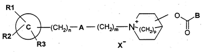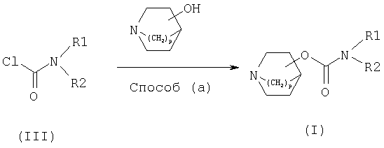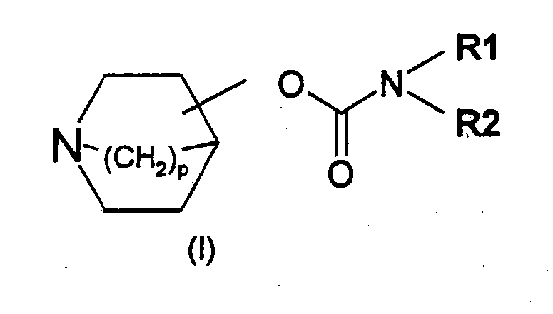 где Z означает О, N или S; R3 определено, как указано выше, и R6, R7 и R8 каждый независимо означают атом водорода или галогена или группу гидрокси, фенил, -OR4, -SR4, -NR4R5, -NHCOR4, -CONR4R5, -CN, -NO2, -COOR4 или -CF3 или содержащую от 1 до 6 атомов углерода группу алкила с прямой или разветвленной цепью, которая является незамещенной либо замещенной одной или несколькими гидроксильными группами или C1-C6-алкоксигруппами; где R4 и R5 каждый независимо означают атом водорода, группу алкила, содержащую от 1 до 6 атомов углерода с прямой или разветвленной цепью, или R4 и R5 вместе образуют алициклическое кольцо, содержащее от 3 до 8 атомов углерода; или R6 и R7 вместе образуют ароматическое кольцо, содержащее от 5 до 14 атомов углерода, алициклическое кольцо, содержащее от 3 до 8 атомов углерода, или гетероциклическое кольцо, содержащее от 3 до 10 членов; и X– означает фармацевтически приемлемый анион моно- или поливалентной кислоты. 3. Соединение по п.1 или п.2, в котором p равно 2. 4. Соединение по любому из пп.1-3, в котором R1 означает группу фенила, 4-фторфенила, 4-метилфенила, тиофен-2-илметила, тиенила или фуран-2-илметила. 5. Соединение по любому из предшествующих пунктов, в котором R2 означает группу бензила, тиофен-2-илметила, тиофен-3-илметила, фуран-2-илметила, фенетила, пент-4-енила, пентила, бутила, аллила или циклопентила. 6. Соединение по любому из предшествующих пунктов, в котором В представляет собой атом водорода или замещенную или незамещенную группу фенила, пирролила, тиенила или фурила, или группу бифенила, нафталинила, 5,6,7,8-тетрагидронафталинила или бензо[1,3]диоксолила. 7. Соединение по п.6, в котором В означает замещенную или незамещенную группу фенила и R6, R7 и R8 каждый независимо означают атом водорода или галогена или группу гидроксила, метила, -CH2ОН, -OMe, -NMe2, -NHCOMe, -CONH2, -CN, -NO2, -COOMe или -CF3. 8. Соединение по п.7, где В означает группу фенила, 4-фторфенила или 3-гидроксифенила. 9. Соединение по любому из предшествующих пунктов, в котором n=0 или 1; m соответствует целому числу от 1 до 6 и А означает группу -CH2-, -СН=СН-, -СО-, -NMe, -О- или -S-. 10. Соединение по п.9, в котором m равно 1, 2 или 3, а A означает группу -СН2-, -СН=СН- или -O-. 11. Соединение по любому из предшествующих пунктов, в котором B-(CH2)n-A-(CH2)m– соответствует группе, выбранной из 3-феноксипропила, 2-феноксиэтила, 3-фенилаллила, фенетила, 3-фенилпропила, 3-(3-гидроксифенокси)пропила, 3-(4-фторфенокси)пропила, 3-тиофен-2-илпропила, 1-аллила и 1-гептила. 12. Соединение по любому из предшествующих пунктов, в котором X– представляет собой анион хлорида, бромида или трифторацетата. 13. Соединение по любому из предшествующих пунктов, в котором бициклическая группа замещена в положении 3. 14. Соединение по п.13, в котором заместитель в положении 3 имеет (R)-конфигурацию. 15. Соединение по любому из предшествующих пунктов, которое является отдельным (одиночным) изомером. 16. Соединение по п.1, которое представляет собой: 1-азабицикло[2.2.2]окт-3-(R)иловый эфир бензилфенилкарбаминовой кислоты; 1-азабицикло[2.2.2]окт-3-(R)иловый эфир бензил(4-фторфенил)карбаминовой кислоты; 1-азабицикло[2.2.2]окт-3-(R)иловый эфир бензил-п-толилкарбаминовой кислоты; 1-азабицикло[2.2.2]окт-3-(R)иловый эфир бутилфенилкарбаминовой кислоты; 1-азабицикло[2.2.2]окт-3-(R)иловый эфир фенилтиофен-2-илметилкарбаминовой кислоты; 1-азабицикло[2.2.2]окт-3-(R)иловый эфир фенетилфенилкарбаминовой кислоты; 1-азабицикло[2.2.2]окт-3-(R)иловый эфир пентилфе