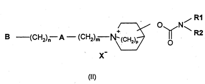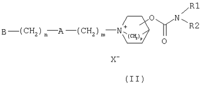 в которых Z означает О, N или S; R3 определен, как указано выше; и R6, R7 и R8, каждый независимо, означают атом водорода или галогена, или группу гидрокси, фенил, -OR4, -SR4, -NR4R5, -NHCOR4, -CONR4R5, -CN, -NO2, -COOR4 или -CF3, или содержащую от 1 до 6 атомов углерода группу алкила с прямой или разветвленной цепью, которая является незамещенной либо замещенной одной или несколькими гидроксильными группами или C1-C6-алкоксигруппами, где R4 и R5, каждый независимо, представляют собой атом водорода, группу низшего алкила с прямой или разветвленной цепью, или R4 и R5 вместе образуют алициклическое кольцо; или R6 и R7 вместе образуют ароматическое, алициклическое или гетероциклическое кольцо; и Х– означает фармацевтически подходящий анион моно- или поливалентной кислоты. В соединениях четвертичного аммония данного изобретения, включая соединения, представленные формулой (II), эквивалент аниона (X–) ассоциирован с положительным зарядом атома N. Х– может быть анионом различных минеральных кислот, таким как, например, хлорид, бромид, иодид, сульфат, нитрат, фосфат, или анионом органической кислоты, таким как, например, ацетат, трифторацетат, малеат, фумарат, цитрат, оксалат, сукцинат, тартрат, малат, манделат, метансульфонат и п-толуолсульфонат. X– предпочтительно является анионом, выбранным из хлорида, бромида, иодида, сульфата, нитрата, ацетата, малеата, оксалата или сукцината. Более предпочтительно, X– означает хлорид, бромид, трифторацетат или метансульфонат. Приведенные в описании группы низшего алкила и фрагменты, если не указано особо, представляют собой алкильные группы с прямой или разветвленной цепью, содержащие от 1 до 6 атомов углерода, предпочтительно от 1 до 4 атомов углерода. Предпочтительные группы и фрагменты низшего алкила включают в себя метил, этил, н-пропил, изо-пропил, н-бутил, втор-бутил и трет-бутил. Упомянутые в описании алкильные группы, содержащие от 3 до 8 углеродов, такие как группы, представленные в группе R2, включают в себя н-пропил, изо-пропил, н-бутил, втор-бутил, трет-бутил, пентил, гексил, гептил и октил. Упомянутые в описании, возможно замещенные группы низшего алкила включают в себя группы алкила с прямой или разветвленной цепью, содержащие от 1 до 6, предпочтительно от 1 до 4 атомов углерода, как упомянуто выше, которые могут быть незамещенными или замещенными в любом положении одним или несколькими заместителями, например 1, 2 или 3 заместителями. Если имеется два или более заместителей, каждый из заместителей может быть одним и тем же или отличаться. Заместитель(и) обычно представляет собой гидрокси- или алкоксигруппы. Упоминаемые в описании группы алкенила, имеющие 3-8 атомов углерода, такие как группы, представленные в группе R2, являются группами с прямой или разветвленной цепью, такими как пропенил, бутенил, пентенил, гексенил, гептенил или октенил с прямой или разветвленной цепью. Двойная связь может находиться в любом положении в группе алкенила, например на концевой связи относительно карбаматной группы. Упоминаемые в описании алкоксигруппы, такие как группы, представленные в группе В, обычно означают группы низшего алкокси, которые являются группами, содержащими от 1 до 6 атомов углерода, предпочтительно от 1 до 4 атомов углерода, с углеводородной цепью, которая является разветвленной или прямой. Предпочтительные алкоксигруппы включают в себя м