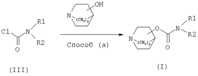 Предпочтительные соединения по изобретению имеют величину IC50 (нМ) для рецепторов М3 меньше 35, предпочтительно меньше 25, 20 или 15, более предпочтительно менее 10. Испытание на бронхоспазм у морских свинок Исследования проводили согласно H. Konzett and Rossler (1940), Arch. Exp. Path. Pharmacol. 195, 71-74. Водные растворы агентов, которые необходимо тестировать, вводили распылением и ингаляцией анестезированным самцам морских свинок, которым проводили искусственную вентиляцию легких (Dunkin-Hartley). Бронхиальную ответную реакцию на внутривенную стимуляцию ацетилхолином определяли до и после введения лекарственного средства и изменения в легочной резистентности по нескольким временным точкам выражали как процент ингибирования бронхоспазма. Соединения данного изобретения проявляли бронхолитическую активность с высокой эффективностью и длительной продолжительностью действия. Из представленных выше результатов каждый из специалистов в данной области легко может понять, что соединения данного изобретения характеризуются хорошей антимускариновой активностью (М3) и, таким образом, являются эффективными при лечении заболеваний, в которые вовлечен мускариновый рецептор М3, включая респираторные заболевания, такие как хроническое обструктивное заболевание легких, бронхит, астма, повышенная реактивность бронхов и ринит; урологические заболевания, такие как недержание мочи, поллакиурия, нейрогенный мочевой пузырь, ночное недержание мочи, неустойчивый мочевой пузырь, цистоспазм и хронический цистит; желудочно-кишечные заболевания, такие как синдром раздраженной толстой кишки, спастический колит, дивертикулит и образование пептических язв; и сердечно-сосудистые нарушения, такие как вагус-индуцированная синусовая брадикардия. Например, соединения данного изобретения используются для лечения респираторных заболеваний, таких как хроническое обструктивное заболевание легких, хронический бронхит, астма и ринит; урологических заболеваний, таких как недержание мочи, учащенное мочеиспускание при нейрогенной поллакиурии, нейрогенный мочевой пузырь, ночное недержание мочи, неустойчивый мочевой пузырь, цистоспазм и хронический цистит; и желудочно-кишечных заболеваний, таких как синдром раздраженной толстой кишки, спастический колит, дивертикулит. Кроме того, в данном изобретении предлагается соединение формулы (I) или (II) или фармацевтически приемлемая композиция, содержащая соединение формулы (I) или (II), для применения в способе лечения человека и животных, в особенности для лечения респираторного, урологического и желудочно-кишечного заболевания. Кроме того, в данном изобретении предлагается применение соединения формулы (I) или (II) или фармацевтически приемлемой композиции, содержащей соединение формулы (I) или (II), для производства лекарственного средства для лечения респираторного, урологического и желудочно-кишечного заболевания. Далее, соединения формулы (I) или (II) и фармацевтические композиции, содержащие соединение формулы (I) или (II), можно использовать в способе лечения респираторного, урологического и желудочно-кишечного заболевания, который включает введение человеку или животному эффективного количества соединения формулы (I) или (II) или фармацевтической композиции, содержащей соединение формулы (I) или (II), при необходимости такого лече
