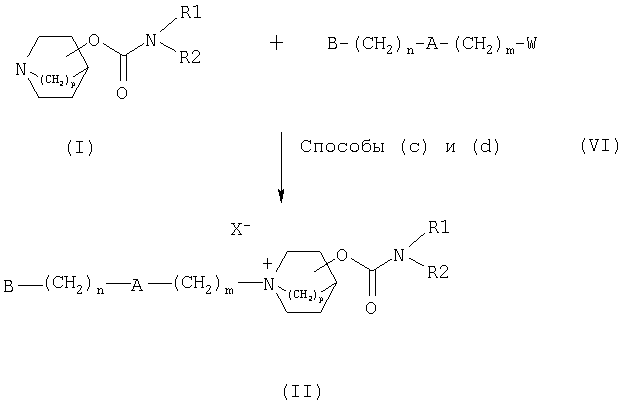 в которой m, n, А и В определены, как указано выше, a W означает уходящую группу; и, если W представляет собой группу иную, чем группа X, проведение реакции обмена в соответствии со стандартными методами, чтобы заменить анион W требуемым анионом X–. 21. Способ по п.20, при котором W означает группу X, которая определена в п.2 или 12. 22. Способ по п.20 или 21, в котором полученную реакционную смесь очищают экстракцией твердой фазы. 23. Фармацевтическая композиция, обладающая ингибирующей активностью в отношении мускариновых рецепторов МЗ и содержащая соединение по любому из пп.1-18 в смеси с фармацевтически приемлемым носителем или разбавителем. 24. Применение соединения по любому из пп.1-18 в производстве лекарственного средства для лечения респираторного, урологического или желудочно-кишечного заболевания или нарушения. 25. Способ ингибирования мускариновых рецепторов у пациента, который включает введение нуждающемуся в этом пациенту – человеку или животному эффективного количества соединения по любому из пп.1-18.