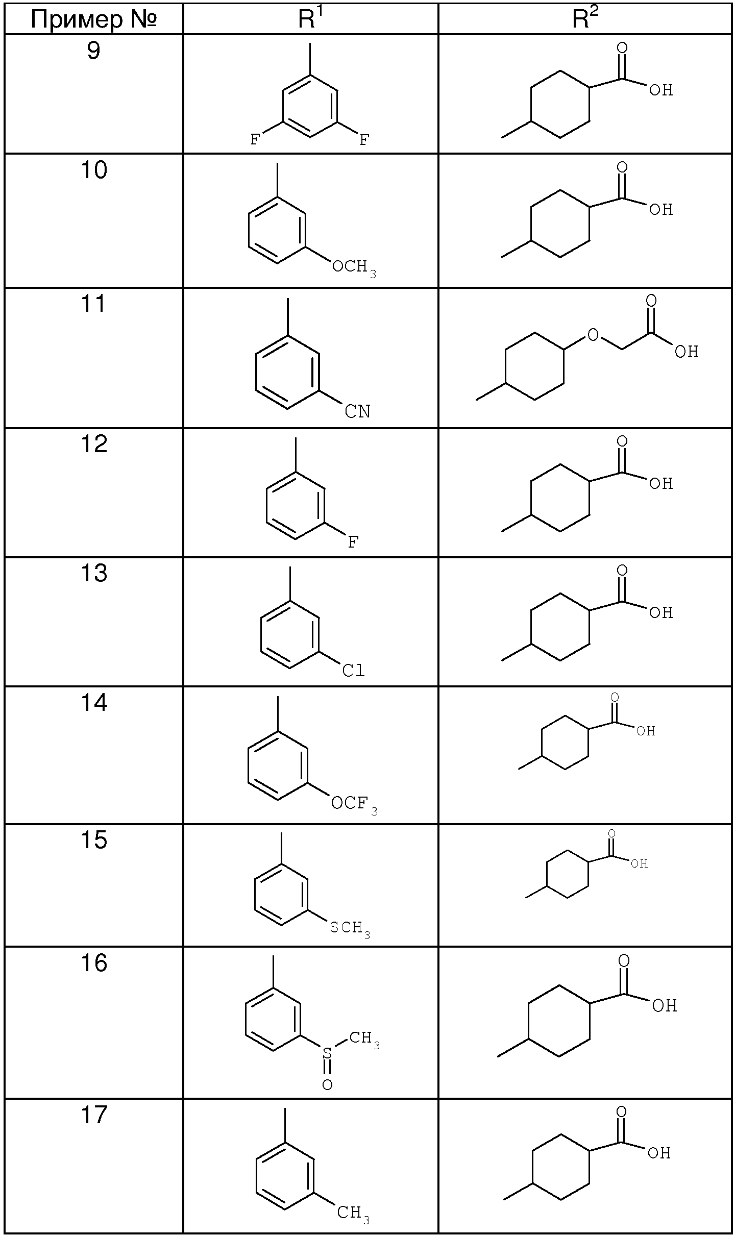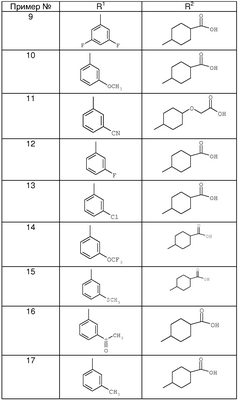 Пример 10: 4-[8-(3-Метоксифенил)-[1,7]нафтиридин-6-ил]циклогексанкарбоновая кислота Гидроокись калия (2М, 0,9 мл) прибавляют к раствору этилового эфира 4-[8-(3-метоксифенил)-[1,7]нафтиридин-6-ил]циклогексанкарбоновой кислоты (230 мг, 0,6 ммоля) в ТГФ/этаноле (6 мл: 2 мл) и нагревают при 80°С в течение 3 часов. Раствор затем разбавляют этилацетатом (120 мл) и экстрагируют водой. С помощью 1М HCl устанавливают в водном слое рН 4, выпадает белый осадок, который экстрагируют дихлорметаном (ДХМ). Дихлорметановый слой промывают водой, затем сушат над сульфатом магния, фильтруют и концентрируют до получения желаемого продукта. Тпл 209-212°С. Масс-спектрометрия положительных ионов с ионизацией при атмосферном давлении (МС (АР+)) 362,9. Этиловый эфир 4-[8-(3-метоксифенил)-[1,7]нафтиридин-6-ил]циклогексанкарбоновой кислоты Это соединение получают способом, аналогичным способу получения этилового эфира 4-[8-(3-цианфенил)-[1,7]нафтиридин-6-ил]циклогексанкарбоновой кислоты, из 8-(3-метоксифенил)-[1,7]нафтиридин-6-илового эфира трифторметансульфокислоты. Очистка с помощью хроматографии с последующим растиранием с диэтиловым эфиром приводит к твердому веществу белого цвета. МС (АР+) 391,0. 8-(3-Метоксифенил)-[1,7]нафтиридин-6-иловый эфир трифторметансульфокислоты Это соединение получают способом, аналогичным способу получения соединения А. МС (TOF ES+) (времяпролетная МС положительных ионов с ионизацией электрораспылением) 384,97. Пример 11: Калиевая соль {4-[8-(3-цианфенил)-[1,7]нафтиридин-6-ил]-циклогексилокси} уксусной кислоты Карбонат калия (10,1 мг, 0,074 ммоля) в воде (1 мл) прибавляют к раствору {4-[8-(3-цианфенил)-[1,7]нафтиридин-6-ил]циклогексилокси}уксусной кислоты (59 мг, 0,15 ммоля) в метаноле (6 мл). Реакционную смесь перемешивают при комнатной температуре 30 минут, фильтруют и концентрируют. Продукт подвергают лиофилизации из воды (×3), затем сушат при 40°С в вакууме в течение 18 часов. Перекристаллизация из дихлорметана/диэтилового эфира приводит к продукту с tпл 148-150°С (разл.), МС (ES+) [M+H]+ 388, 1635. {4-[8-(3-Цианфенил)-[1,7]нафтиридин-6-ил]циклогексилокси}уксусная кислота Трифторуксусную кислоту (ТФК) (2 мл) прибавляют к раствору трет-бутилового эфира {4-[8-(3-цианфенил)-[1,7]нафтиридин-6-ил]циклогексилокси} уксусной кислоты (182 мг, 0,41 ммоля) в дихлорметане (2 мл) при 0°С. Раствор перемешивают при комнатной температуре 1 час, концентрируют и подвергают азеотропной перегонке с толуолом (×3). Очищают с помощью хроматографии на силикагеле, элюируя 7%-ным метанолом в дихлорметане, получают продукт. МС (ES+) [М+Н]+ 388,04. трет-Бутиловый эфир {4-[8-(3-цианфенил)-[1,7]нафтиридин-6-ил] циклогексилокси} уксусной кислоты Прибавляют 1,2-дибромэтан (12 мкл) к суспензии цинковой пыли (589 мг, 9,0 ммолей) в тетрагидрофуране (0,9 мл). Смесь кипятят с обратным холодильником 3 минуты, затем ей дают охладиться до комнатной температуры. Прибавляют триметилсилилхлорид (15 мкл) и смесь перемешивают при комнатной температуре 30 минут. С помощью шприца прибавляют трет-бутиловый эфир (4-иодциклогексилокси)-уксусной кислоты (цис:транс=примерно 1:1) (680 мг, 2,0 ммоля) в ТГФ (1 мл) и смесь нагревают при 40°С в течение 2 часов. Прибавляют раствор Bu4NI, т.е. иодистого тетрабутиламония, (1,1 г, 3,0 ммоля), Pd(dba)2, т.е. палладий-дибензилиденацетон (40 мг, 0,07 ммоля), dppf, т.е. 1,1′-бис(дифенилфосфино)ферроцен (39 мг, 0,07 ммоля), и соединение А (372 мг, 1,0 ммоль) в ТГФ(2 мл)/NMP(2 мл) и смесь нагревают при 40°С в течение 18 часов, затем смес