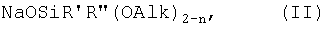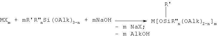 В частности процесс взаимодействия натрийокси(алкокси)органосилана с солью металла можно осуществлять одновременно с процессом образования натрийокси(алкокси)органосилана из гидроксида натрия и алкоксиорганосилана, выбранного из ряда алкоксиорганосиланов общей формулы (V),