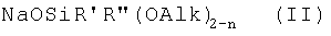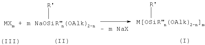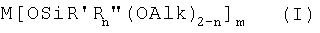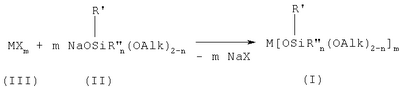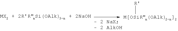 Как в случае двухвалентного металла, так и в случае трехвалентного металла Alk может означать CH3– или C2H5-, R’ может означать CH3– или C6H5– или NH2(CH2)3-. В частности, в случаях, когда n равно 0, R” означает заместитель CH2=CH-.
