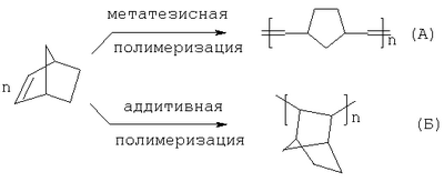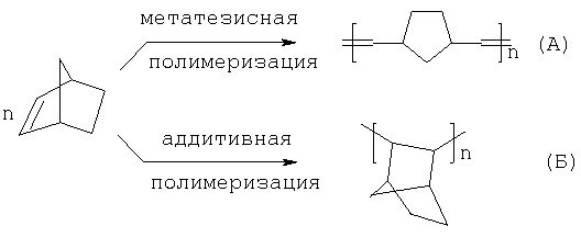 Известно, что норборнен и его производные способны полимеризоваться по метатезисной схеме, включающей раскрытие цикла и образование непредельных полициклопентиленвиниленов (ring-opening metathesis polymerization – ROMP) (А), и по аддитивной схеме (Б), протекающей с сохранением бициклической структуры, то есть с раскрытием только -компоненты двойной связи и приводящей к образованию насыщенных полимерных структур [1].