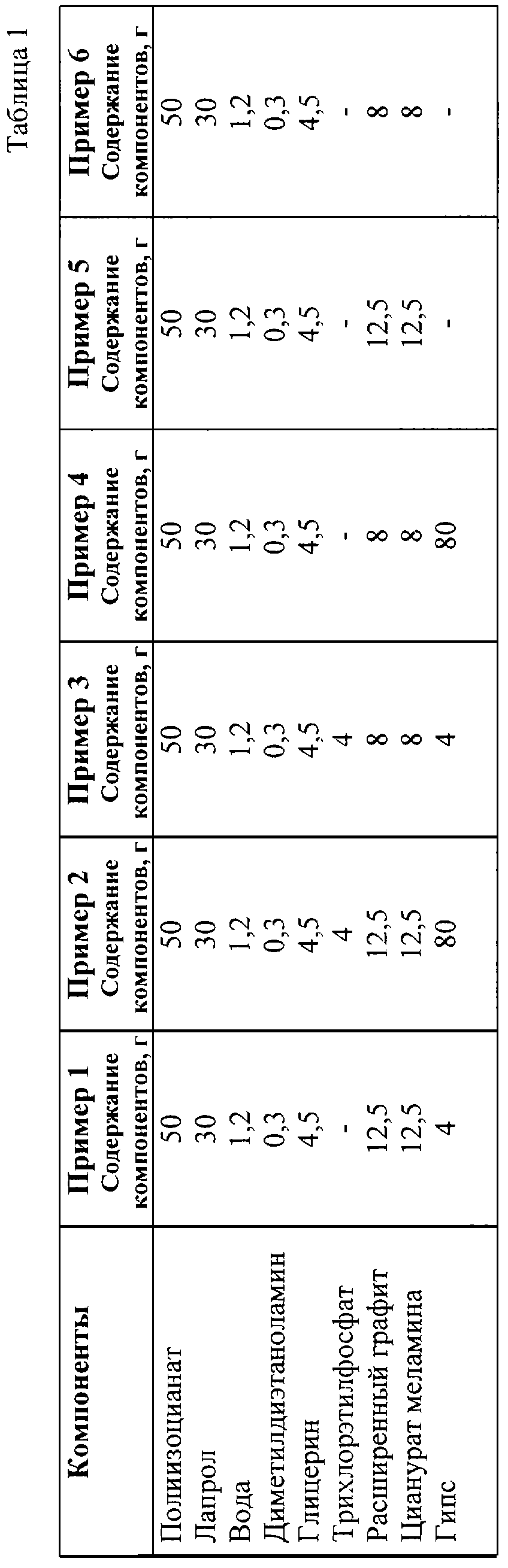 1. Способ получения огнестойкого пенополиуретана из композиции, включающей полиэфирполиол, полиизоцианат, аминный активатор, модифицирующую добавку – многоатомные спирты и вспениватель – воду или фреон, расширенный графит, предварительно смешанный с циануратом меламина при соотношении 1-2:1 и суммарном количестве 15-30% от общего количества компонентов, отличающийся тем, что в предварительно приготовленную смесь графита с циануратом меламина дополнительно вводят гипс, полиэфирполиол перед взаимодействием с полиизоцианатом предварительно смешивают сначала с аминным активатором, многоатомным спиртом и вспенивателем, а затем добавляют смесь расширенного графита, цианурата меламина и гипса в количестве от 5 до 50% от общего количества компонентов. 2. Способ по п.1, отличающийся тем, что дополнительно композиция содержит антипирен – трихлорэтилфосфат.
