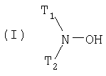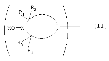 где T1 – линейный или разветвленный алкил с 1 – 36 атомами углерода, циклоалкил с 5-12 атомами углерода, аралкил с 7-9 атомами углерода, или упомянутый аралкил, замещенный одним или двумя алкилами, содержащими от 1 до 12 углеродных атомов, или одним или двумя атомами галогена; и T2 – водород, или, независимо, то же, что и T1. Альтернативно, гидроксиламиновые стабилизаторы компонента i.) настоящего изобретения представляют собой соединения, которые содержат одну или более групп формулы (II)
