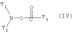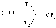 где T1 – линейный или разветвленный алкил, содержащий от 1 до 36 атомов углерода, циклоалкил с числом атомов углерода от 5 до 12, аралкил с числом атомов углерода от 7 до 9, или указанный аралкил, замещенный одним или двумя алкилами с числом углеродных атомов от 1 до 12, или одним или двумя атомами галогена; Т2 – водород, или, независимо, то же, что и T1; и Т3 – аллил, линейный или разветвленный алкил с числом углеродных атомов от 1 до 36, циклоалкил с числом атомов углерода от 5 до 18, циклоалкенил с числом углеродных атомов от 5 до 18, или линейный или разветвленный алкил с числом углеродных атомов от 1 до 4, замещенный фенилом, или фенилом, замещенным одним или двумя алкильными группами с числом углеродных атомов от 1 до 4, или одним или двумя атомами галогена. Например, замещенные гидроксиламины компонента ii.) могут быть О-аллил-N,N-диоктадецилгидроксиламином, или О-н-пропил-N,N-диокта-децилгидроксиламином, или N,N-дигидрированным жирным ацетоксиамином. Нитроны компонента iii.) могут быть, например, такими, как описано в US 4898901, который включается здесь как ссылка. Например, нитроны компонента iii.) имеют формулу V