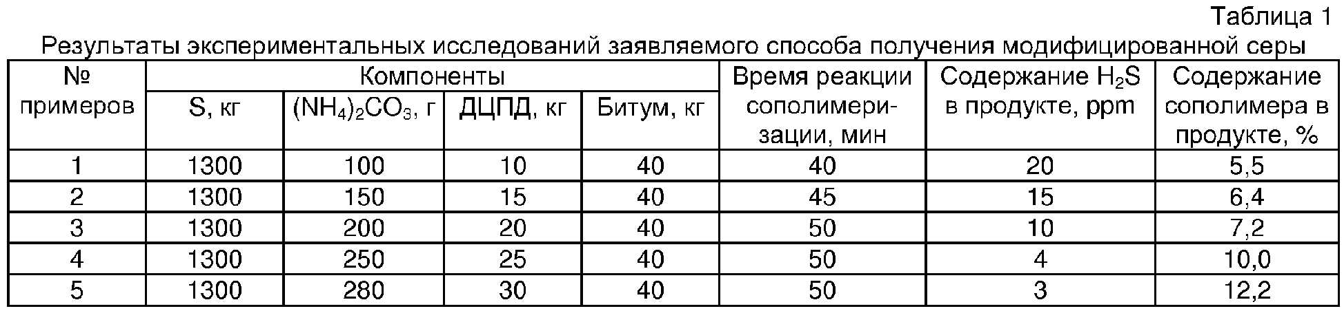 1. Способ получения модифицированной серы, используемой при производстве сероасфальта, путем взаимодействия жидкой серы с дициклопентадиеном и битумом в реакторе при интенсивном перемешивании, отличающийся тем, что, с целью повышения скорости протекания реакции, снижения содержания в продукте сероводорода и повышения прочности сероасфальта, в жидкую серу при температуре 140-150°С подают углеаммонийную соль в количестве 150-250 г на 1 т серы, перемешивая с помощью циркуляционного насоса в течение 20-30 мин после чего смесь охлаждают до 115-120°С и дополнительно вводят дициклопентадиен 10-20 кг на 1 т серы и битум в количестве 2-4% от веса серы, смешанные реагенты перемешиваются с помощью насоса в течение 40-50 мин при температуре, которая поддерживается за счет экзотермичности химических реакций, с последующим охлаждением и кристаллизацией полученного чешуированного продукта. 2. Способ по п.1, отличающийся тем, что смешанные реагенты перемешивают при температуре 135-140°С. 3. Способ по п.1, отличающийся тем, что жидкую модифицированную серу охлаждают до температуры 120-125°С и подают на кристаллизацию в барабанный кристаллизатор для получения чешуированного продукта, пригодного для производства сероасфальта.