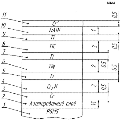 Нанесенные компенсационные слои 5, 7, 9, состоящие из чистого титана, также являются связующими между промежуточными слоями 4 и 6, 6 и 8, 8 и 10. Титан имеет схожие кристаллические решетки как с Cr2N, так и с TiN и с TiC. Металлоподобные твердые материалы, как правило, образуют согласованные или полусогласованные поверхности раздела с металлами и другими металлическими материалами. Так, карбиды и нитриды переходных металлов с диборидами переходных металлов образуют согласованные поверхности раздела с низкой энергией.